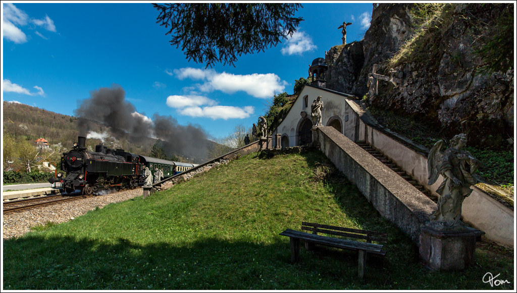 Sonderzug des Vereins Neue Landesbahn bespannt mit der 93.1420 kurz nach Amt Mitterbach auf der Fahrt nach St. Aegyd am Neuwald. (19.04.2015)