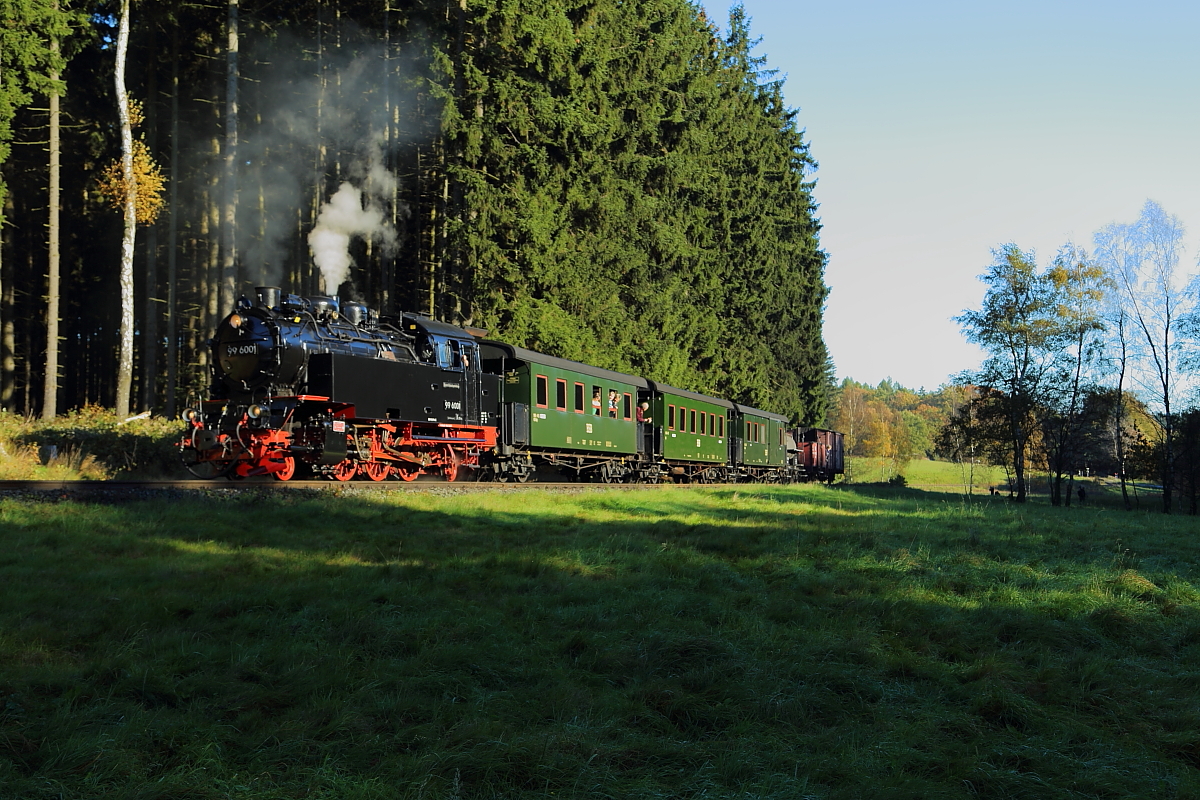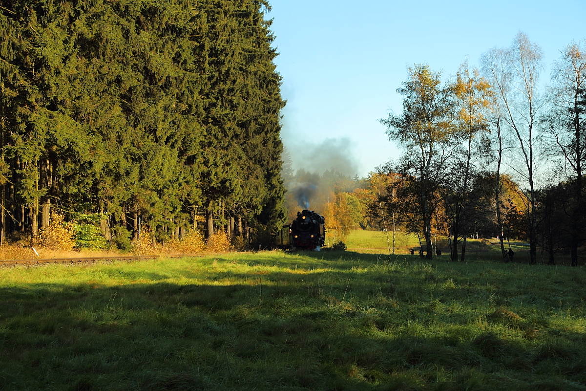 Am Kilometer 6,3, zwischen Sternhaus Haferfeld und Sternhaus Ramberg, gibt es am 19.10.2014 den ersten Fotohalt. Hierfür hat 99 6001 ihren IG HSB-Sonder-PmG gerade zum Stehen gebracht, um die Film- und Fotofreunde aussteigen zu lassen. Danach wird der Zug für eine Scheinanfahrt zurückgedrückt.