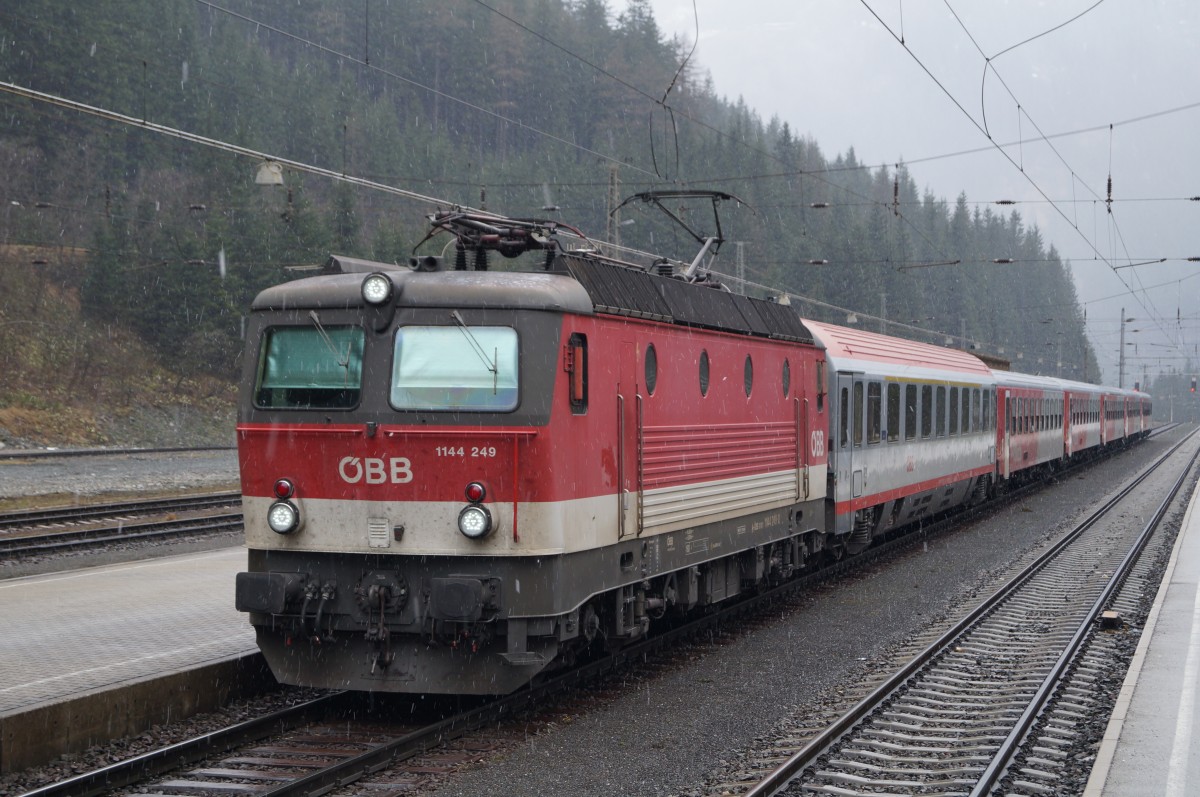 1144 249 mit einer Ersatzgarnitur für IC 592 (Salzburg Hbf - Klagenfurt Hbf) in Böckstein. Aufgrund der Tauernsperre vom 18.4. bis 20.4.2015 verkehrte dieser Zug nur im Bereich Böckstein - Klagenfurt Hbf. (19.4.2015)