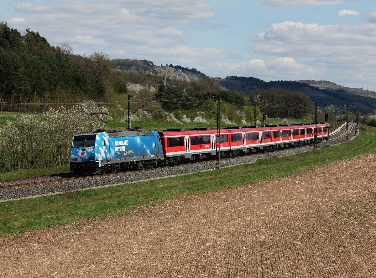 Die 146 246 mit einem RE am 18.04.2015 unterwegs bei Harrbach.