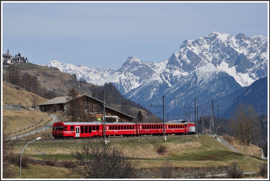 R1945 nach Pontresina mit Steuerwagen 1753 und Ge 4/4 II 633 "Zuoz" bei Lavin. (10.04.2015)
