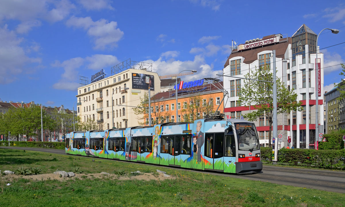 ULF B 737 mit der Vollwerbung für 25 Jahre UN Kinderrechte als Linie 18 am Mariahilfer Gürtel, 18.04.2015