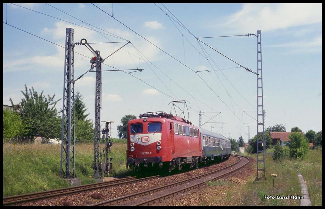 110226 ist am 27.5.1990 um 13.07 Uhr bei Oberschefflenz mit dem E 3208 in Richtung Mosbach unterwegs.