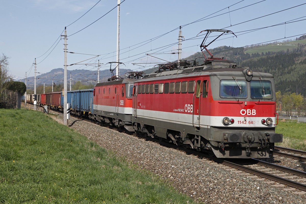 1142 640 + 1144 003 ziehen am 21.04.2015 einen Güterzug bei Niklasdorf durchs Murtal.
