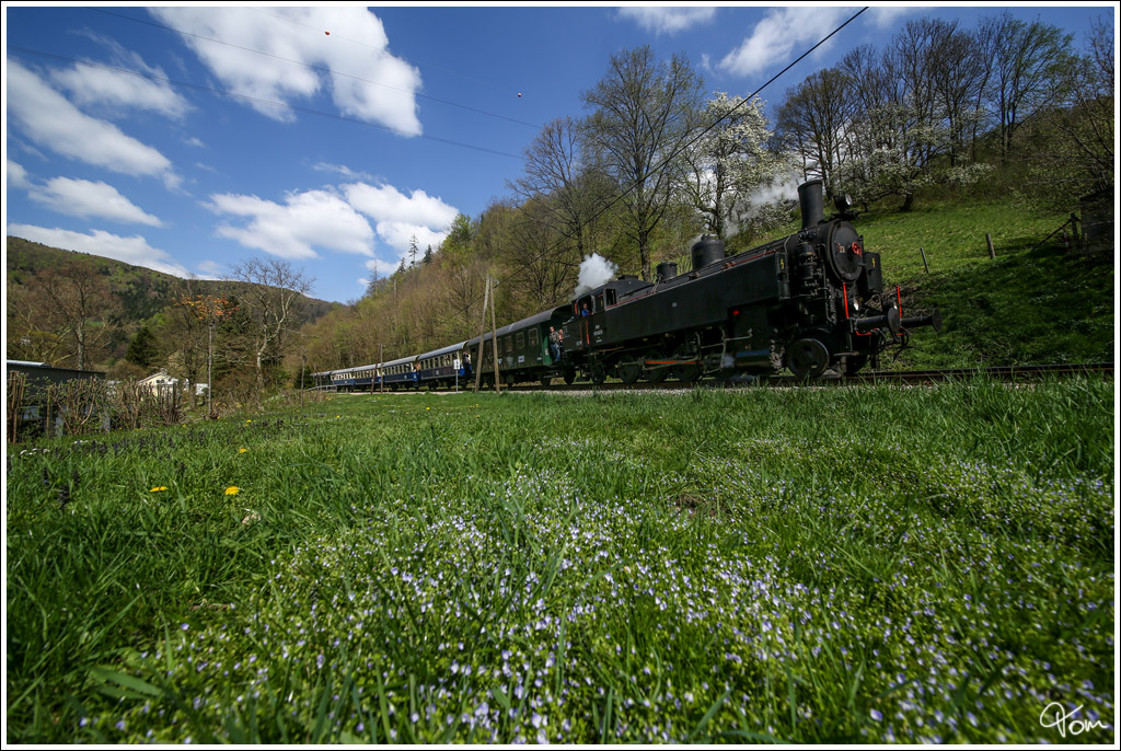 Zittauer Schmalspurbahn am 2.5.1990: Dampflok 991762 macht schon von weitem auf sich aufmerksam, als sie mit dem P 14180 in Obersdorf nahe Zittau in Richtung Bertsdorf unterwegs ist. Zum Glück zieht der Rauch weg von der Schafherde und der Blumenwiese im Vordergrund!
