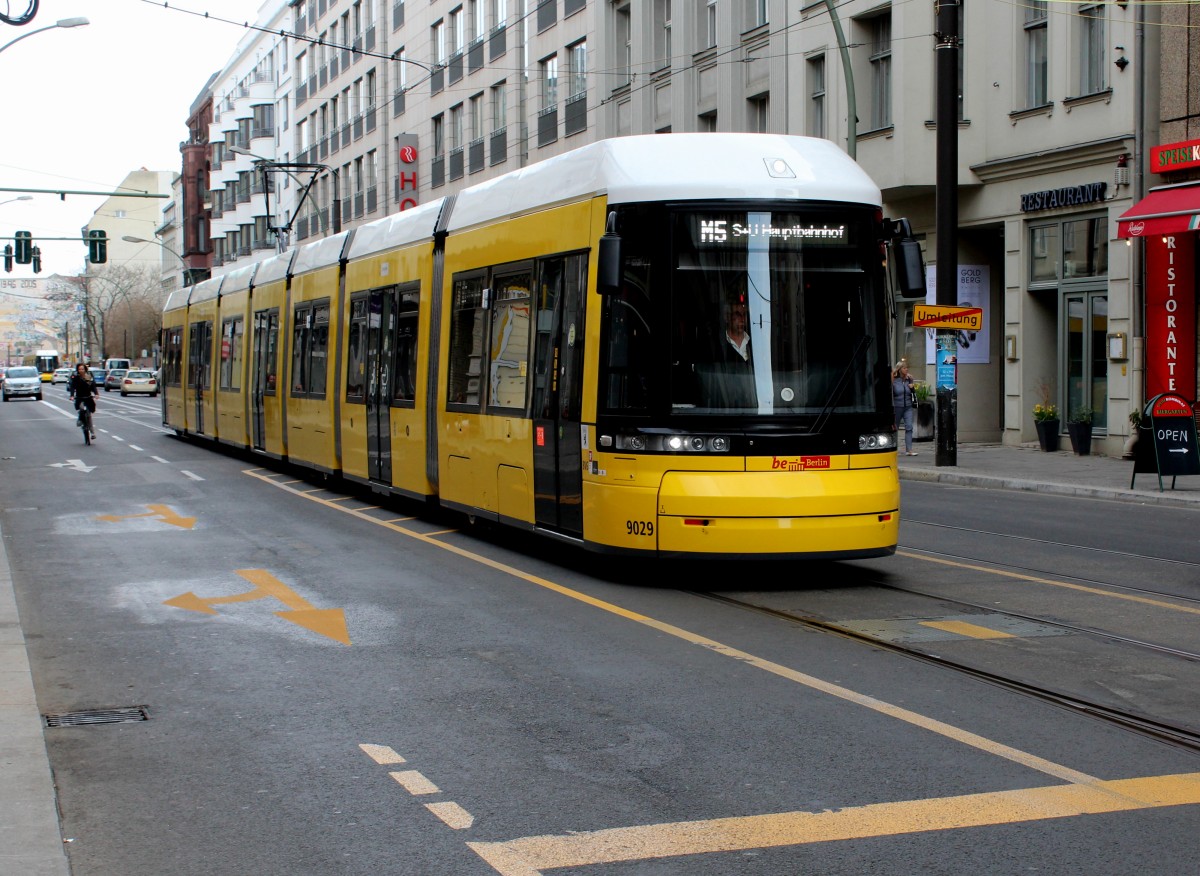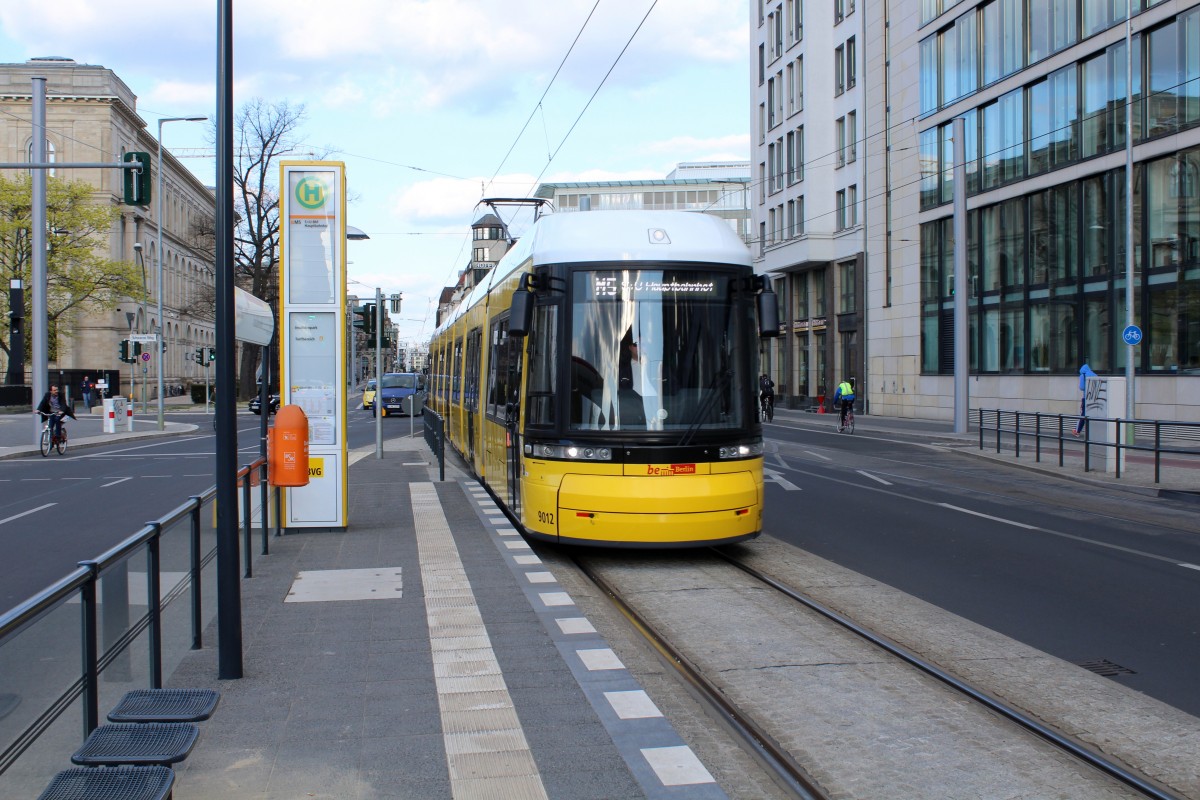 Berlin BVG SL M5 (Bombardier GT8-11ZRL 9029) Chausseestrasse / Invalidenstrasse (Hst. U Naturkundemuseum) am 11. April 2015.