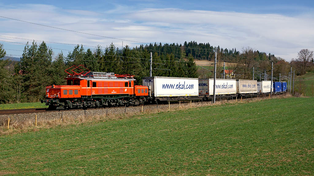 Die Lienzer 1020.018 (ex E94.001) wurde am 20.04.2015 von Villach nach Salzburg überstellt. Bedingt durch die Sperre der Tauernbahn ging die Reise über St. Michael in der Obersteiermark - Selzthal - Bischofshofen, wobei die mittlerweile 75 Jahre alte Maschine einen EKOL-Zug zum Teil solo beförderte. Die Aufnahme entstand bei Passering in Kärnten.