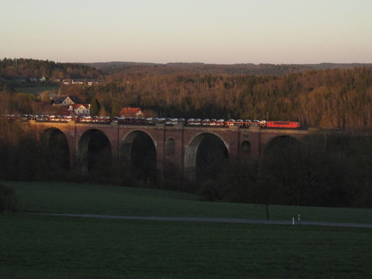 Schatten des Hügels streift die Elstertalbrücke mit dem Autozug nach Nürnberg und der 155 083. Gesehen am 21.04.2015