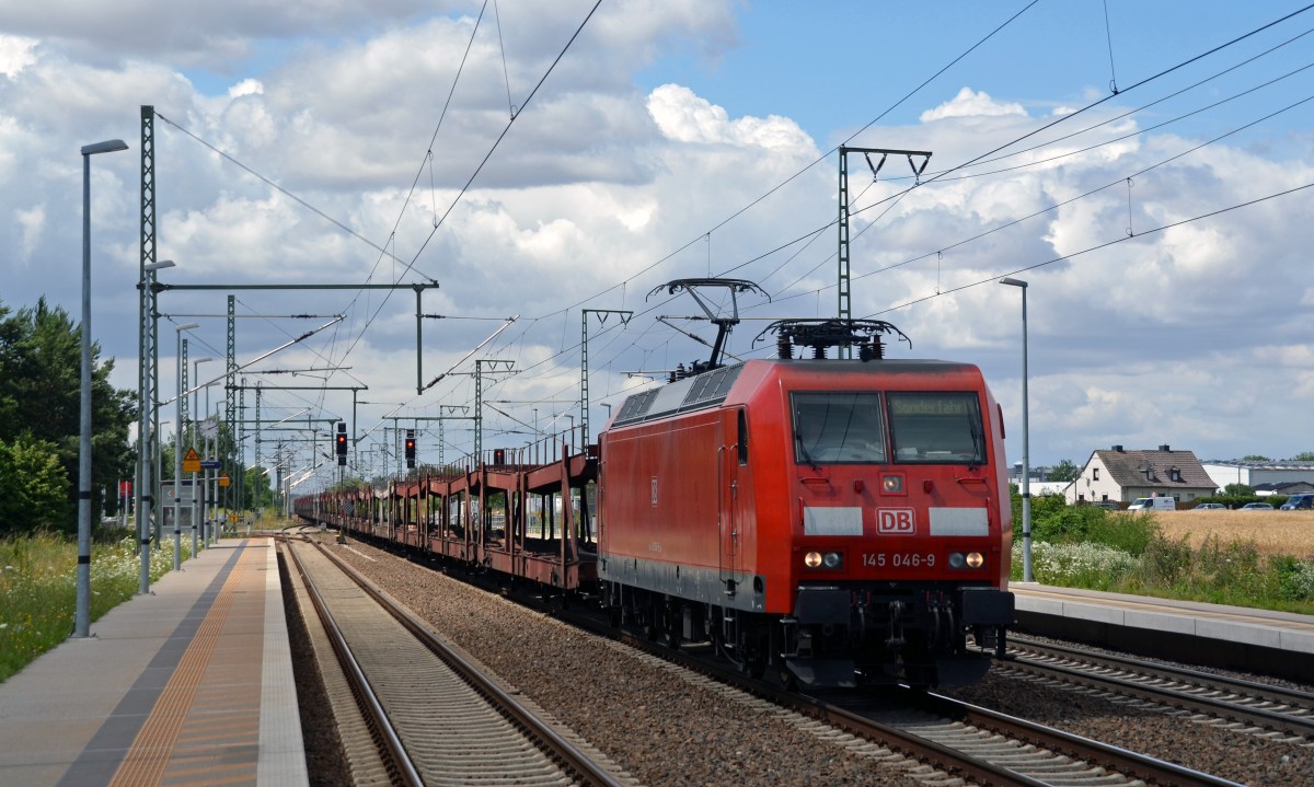 145 046 schleppte am 09.07.15 einen leeren Autozug durch Rodleben Richtung Wittenberg.
