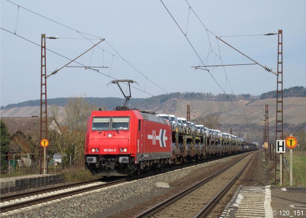 185 604-6 von RheinCargo zieht am 17.März 2015 einen Autozug durch Himmelstadt in Richtung Würzburg