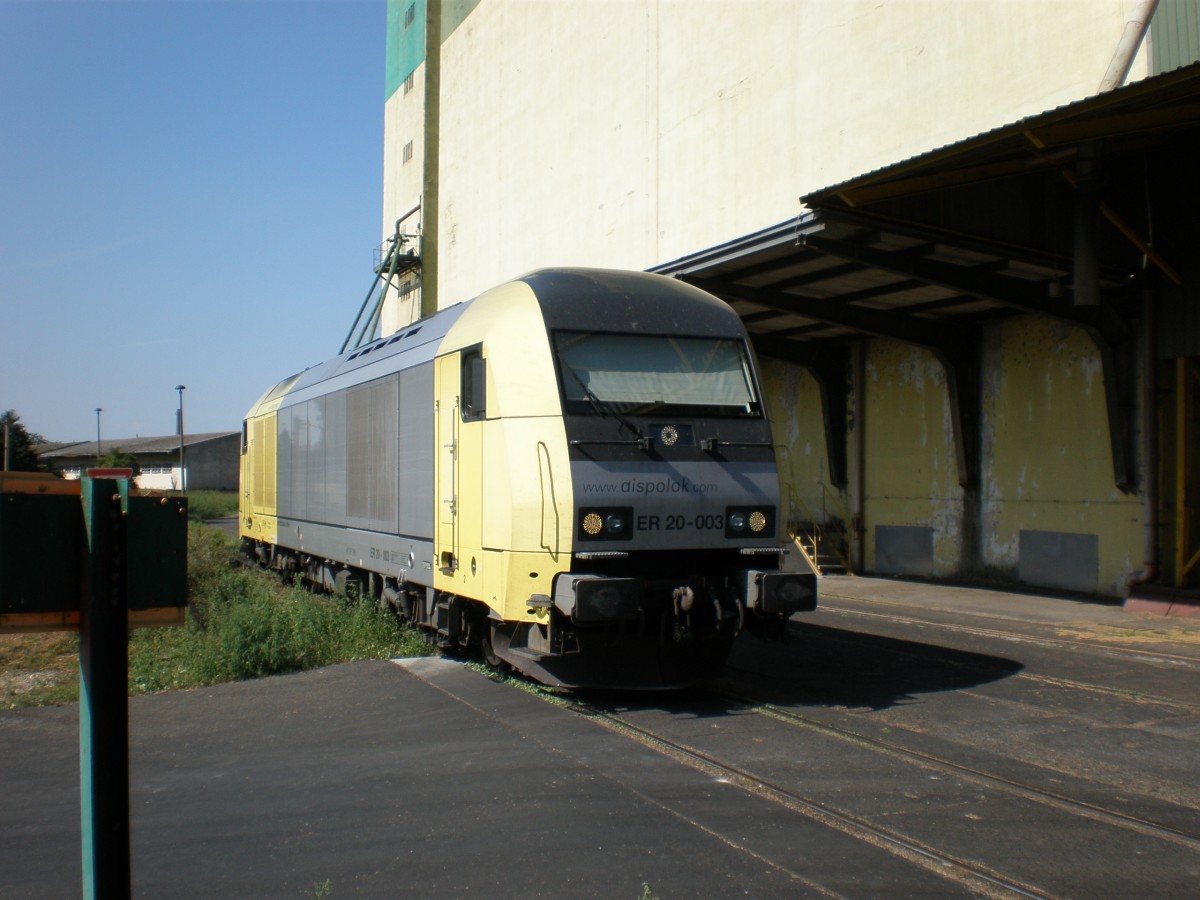 Am 27.08.2009 war der Eurorunner ER 20-003 ,im Einsatz für die HSL GmbH, frisch betankt und setzte wieder an ihre Wagen, welche gerade entladen wurden. Das Bild wurde vom Feldweg unterhalb des Getreidespeichers in Grimmen am Schützenplatz aufgenommen.
