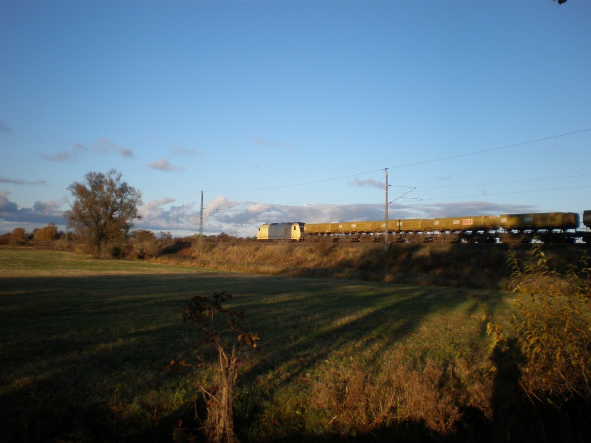 Am 29.10.2009 schob der Eurorunner ER 20-003, im Einsatz für die HSL GmbH, ihren Ganzzug bei schöner Abendstimmung aus dem Anschlussgleis Grimmen-Schützenplatz. Leider ist der Einsatz dieser Baureihe mit diesen angemieteten Seitenkippwagen der Gattung Fans schon lange vorbei. Es war immer interessant verschiedene Bespannungen von Lokomotiven vor den Zügen zu beobachten und Dokumentieren.