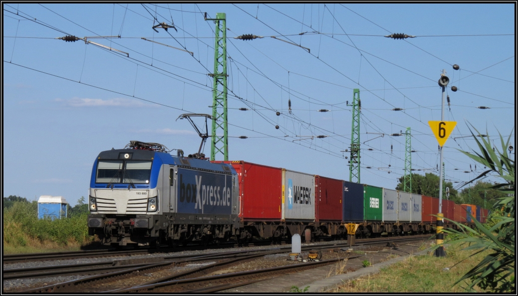 Die Siemens Vectron 193 880 (BoXpress) ist mit ihren Containerzug am Donauufer bei Komarom (H) unterwegs. Szenario wurde Anfang August 2015 bildlich festgehalten.