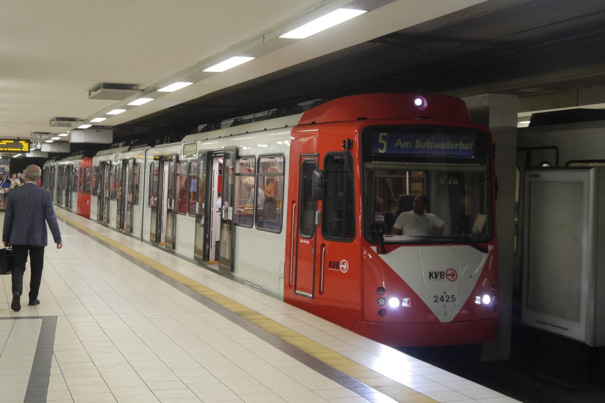 Einer der wenigen umgebauten Stadtbahnzüge, die sich im Planeinsatz befinden: 2425 und 2422 auf SL 5 in der U-Bahn Station Dom/Hbf (12.8.15)