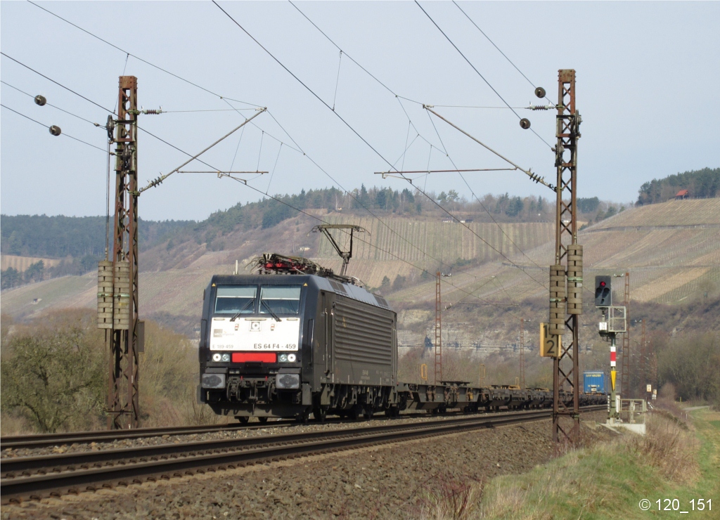 ES 64 F4-459 von MRCE/TXL zieht am 17.März einen LKW-Walter KLV bei Himmelstadt in Richtung Würzburg.