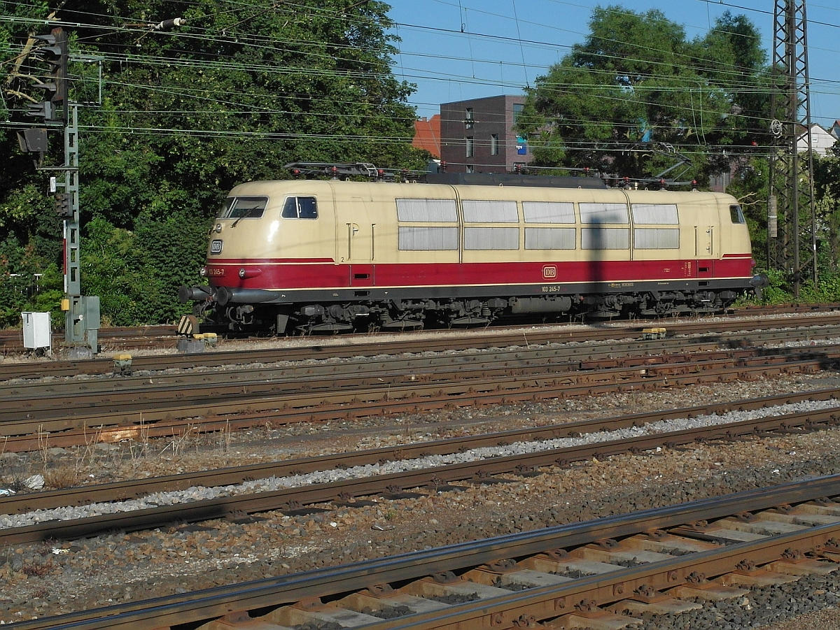 Nach Ankunft auf einem Stumpfgleis im Ulmer Hauptbahnhof des von München gezogenen IC 2094 und dem Abziehen der Wagen durch eine Rangierlok ist für 103 245-7 das Gleis frei, um in die Abstellgruppe zu fahren (01.07.2015).