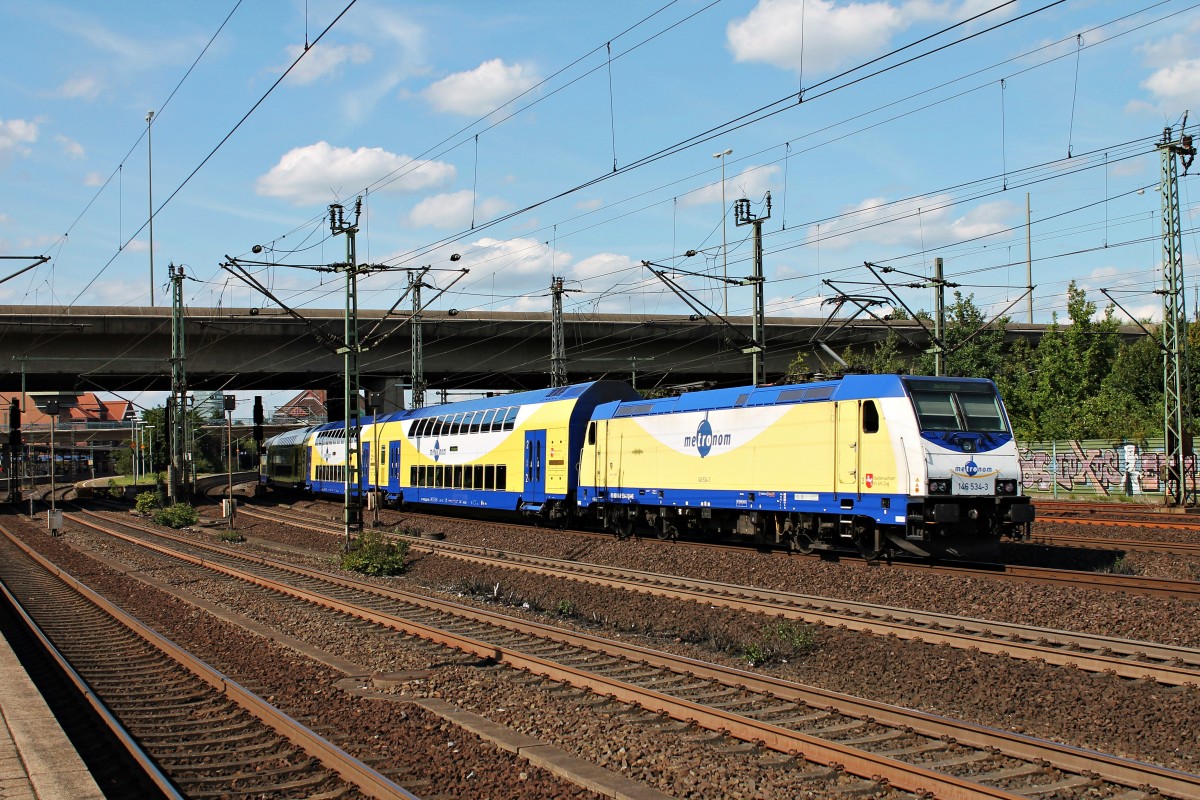 Nachschuss auf 146 534-3 mit einem metronom Leerzug am 13.08.2014 bei der Durchfahrt in Hamburg Harburg.