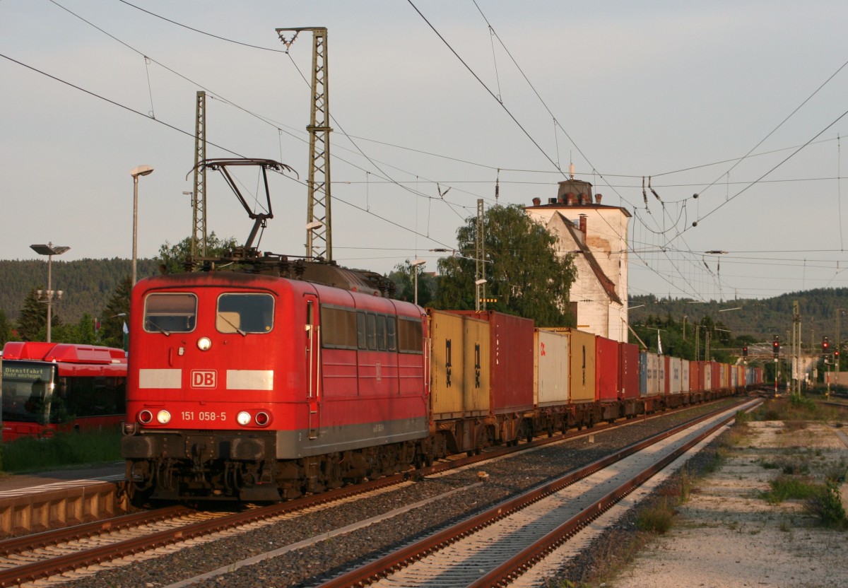 151 058 mit KT 50330 (Burghausen Wackerwerk–Maschen Rbf) am 20.05.2014 in Neumarkt (Opf), aufgenommen vom Bahnsteigende