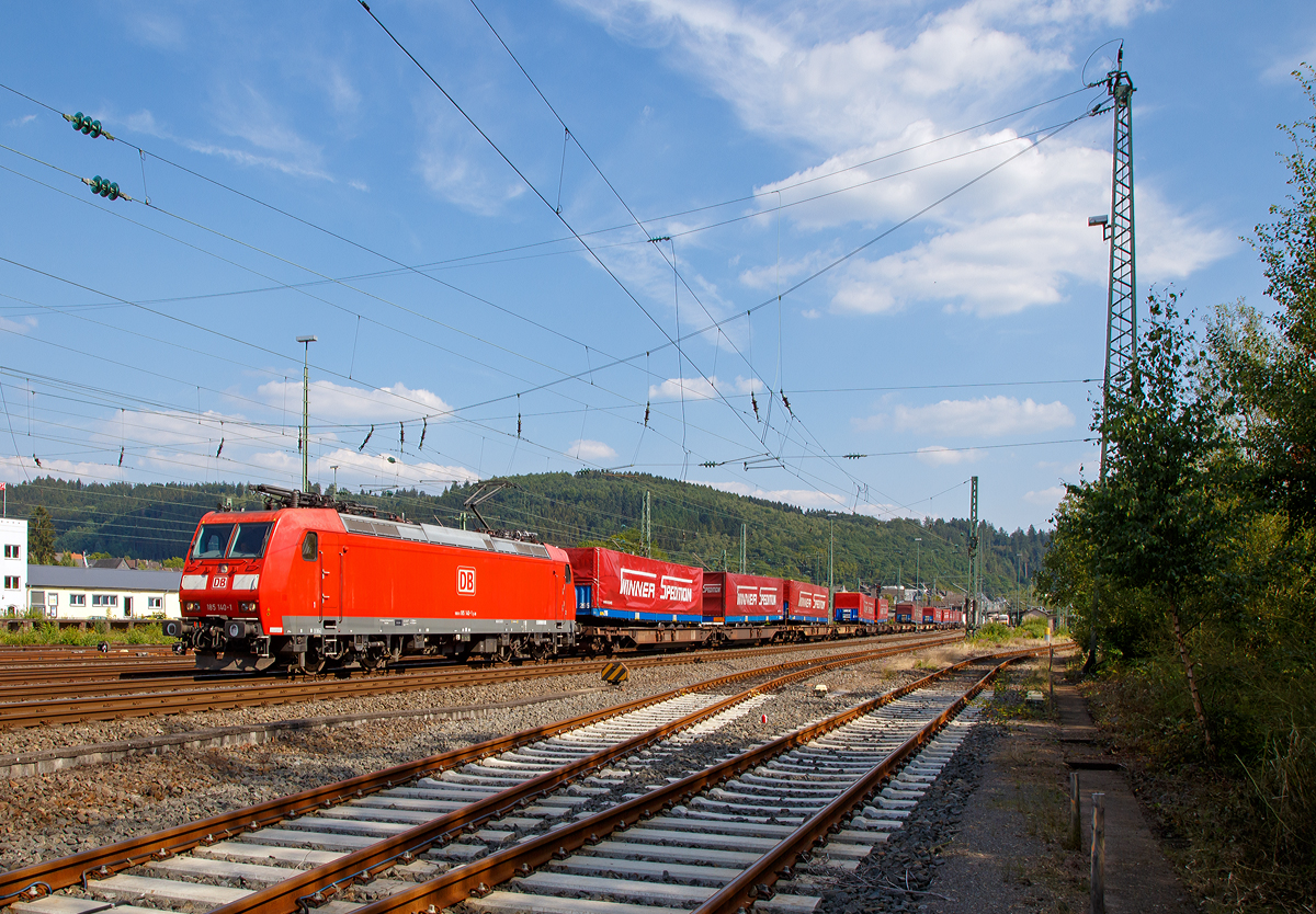 Die 185 140-1 (91 80 6185 140-1 D-DB) der DB Schenker Rail Deutschland AG fährt am 22.08.2015 mit einem  Winner -Ganzzug durch Betzdorf/Sieg in Richtung Köln.