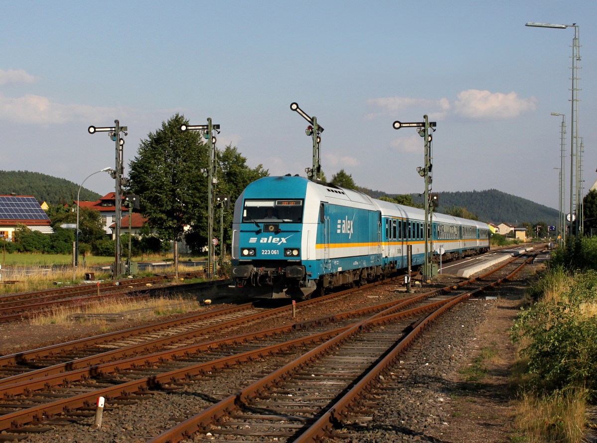 Die 223 061 mit einem Umgeleiteten ALEX nach Hof am 22.08.2015 bei der Durchfahrt in Pressath.
