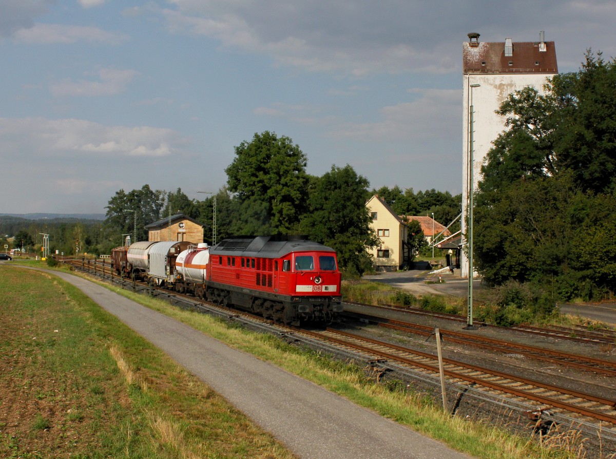 Die 233 176 mit einem Umgeleiteten Güterzug am 22.08.2015 bei der Durchfahrt in Trabitz.