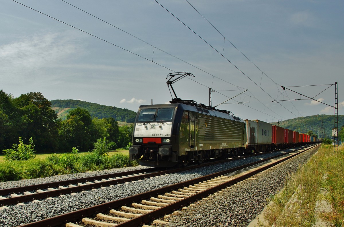 ES 64 F4-280 (189 280) von MRCE hat eien Containerzug am Haken und fährt in Richtung Würzburg und wurde am 12.08.15 bei Gambach abgelichtet.