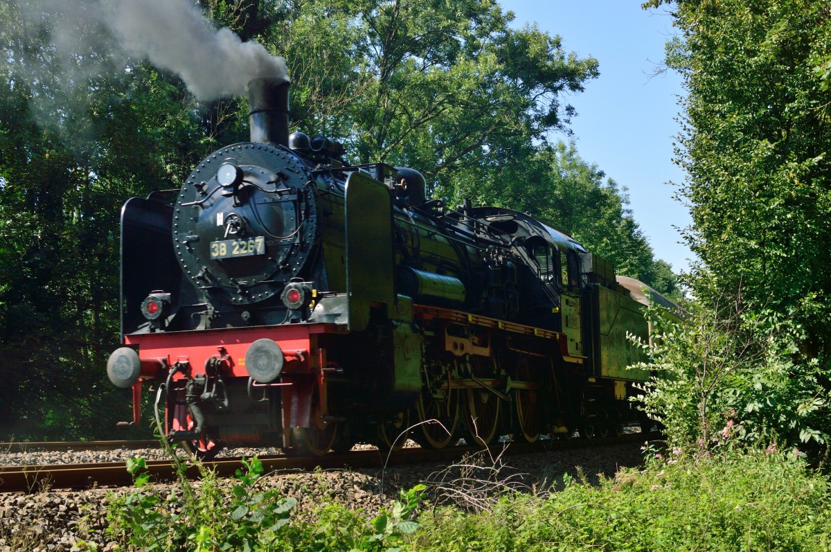 Hier kommt die 38 2267 mit drei alten Schnellzugwagen am Haken und Nachschub durch eine 212 in Mettmann Stadtwald ein. 23.8.2015