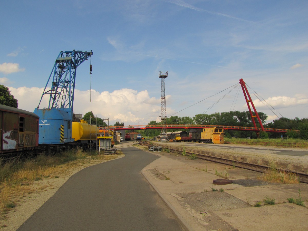 Neben einen alten Kran vom früheren Bw Gera, kann man in Ilmenau auch diese moderne Fußgängerbrücke sehen, die die Gleisanlagen überspannt; 18.07.2015