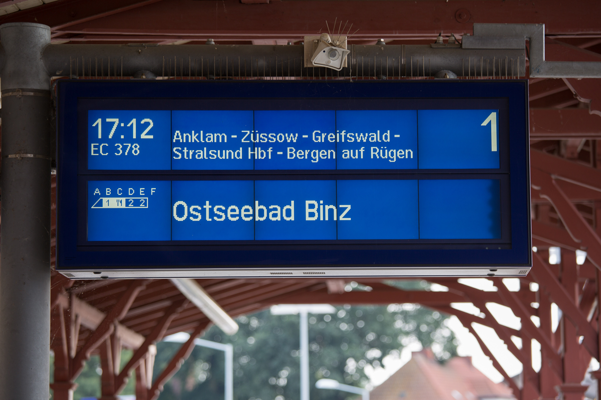 Zugzielanzeiger für EC 378 auf dem Bahnhof Pasewalk. - 23.08.2015