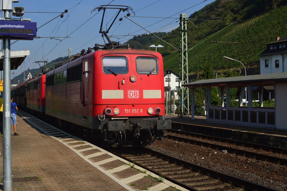 151 052-8 und eine weitere 151 durchfahren am 22.08.2015 den Bahnhof Leutesdorf