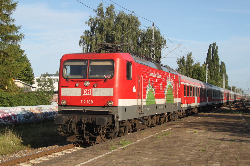 112 108-6( Genau Ihre Richtung ) mit dem Pommes Rot-Weiß Express 13290 von Warnemünde nach Berlin-Ostbahnhof bei der Durchfahrt am 29.08.2015 im Haltepunkt Rostock-Holbeinplatz