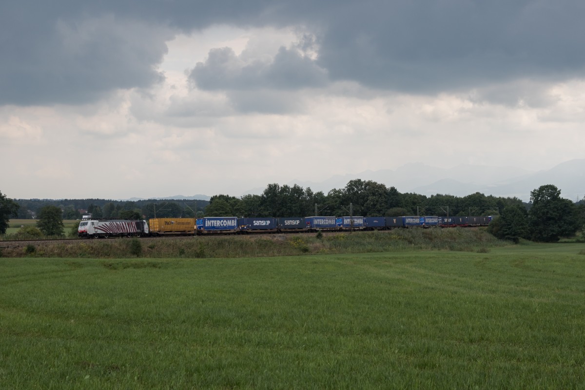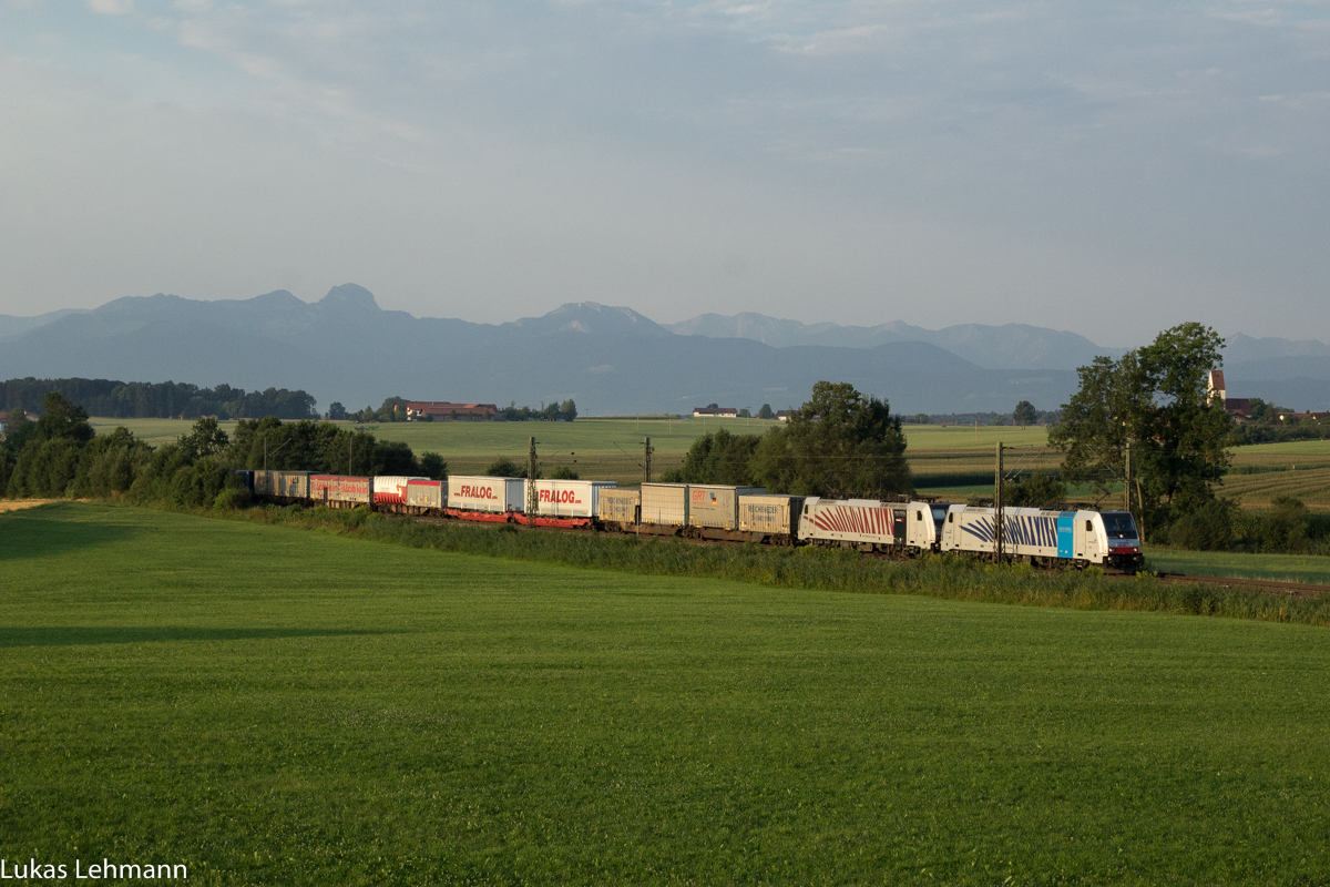 Zwei unbekannte Loks von Lokomotion ziehen einen KLV-Zug in Richtung München, 08.08.2015