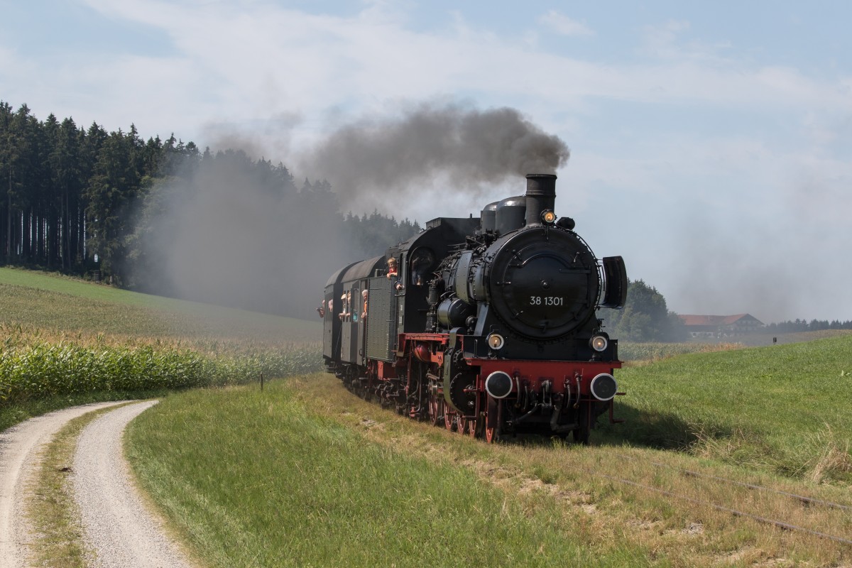 38 1301 der ÖGEG machte am 22. / 23. August 2015 Sonderfahrten auf der Nebenstrecke Bad Endorf - Obing, hier zu sehen bei Aindorf.