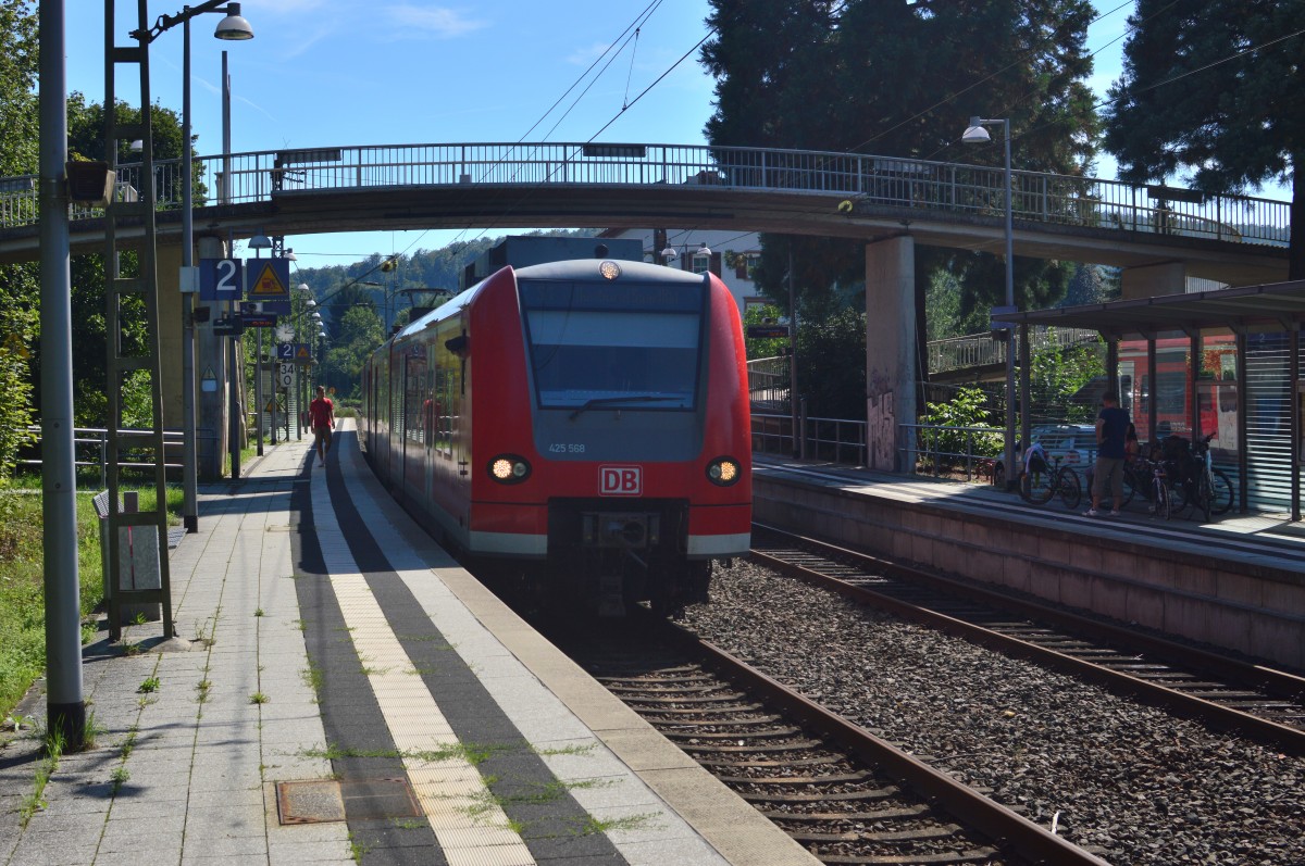 Am heutigen 29.8.2015 steht der 425 568 als S2 nach Kaiserslautern am Bahnsteig Gleis 2 in Neckargerach.