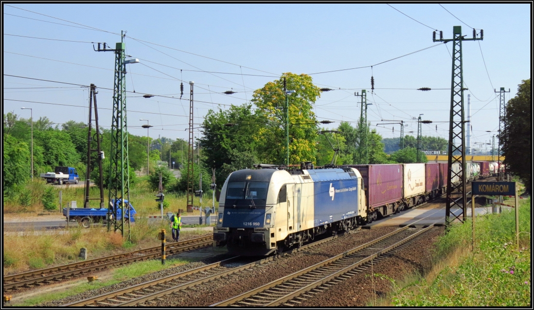 Die Taurus 1216 950 der WLC zieht ihren Aufliegerzug frühmorgens in Richtung Györ. Hier zu sehen am Stadtrand von Komárom (H) Anfang August 2015.