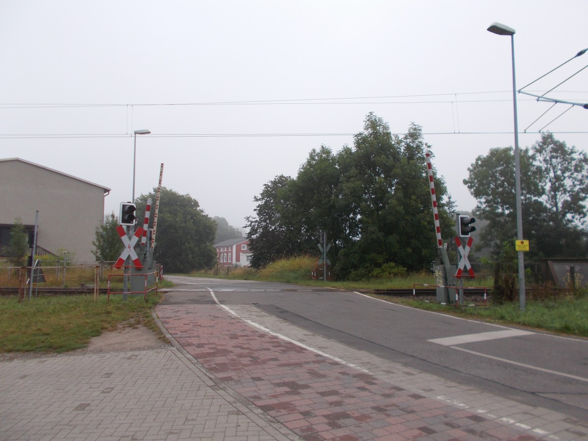 Die Zufahrtsstraße zum Eisenbahnmuseum Pasewalk überquert die Bahnstrecke nach Szczecin.Aufnahme am 16.August 2015.