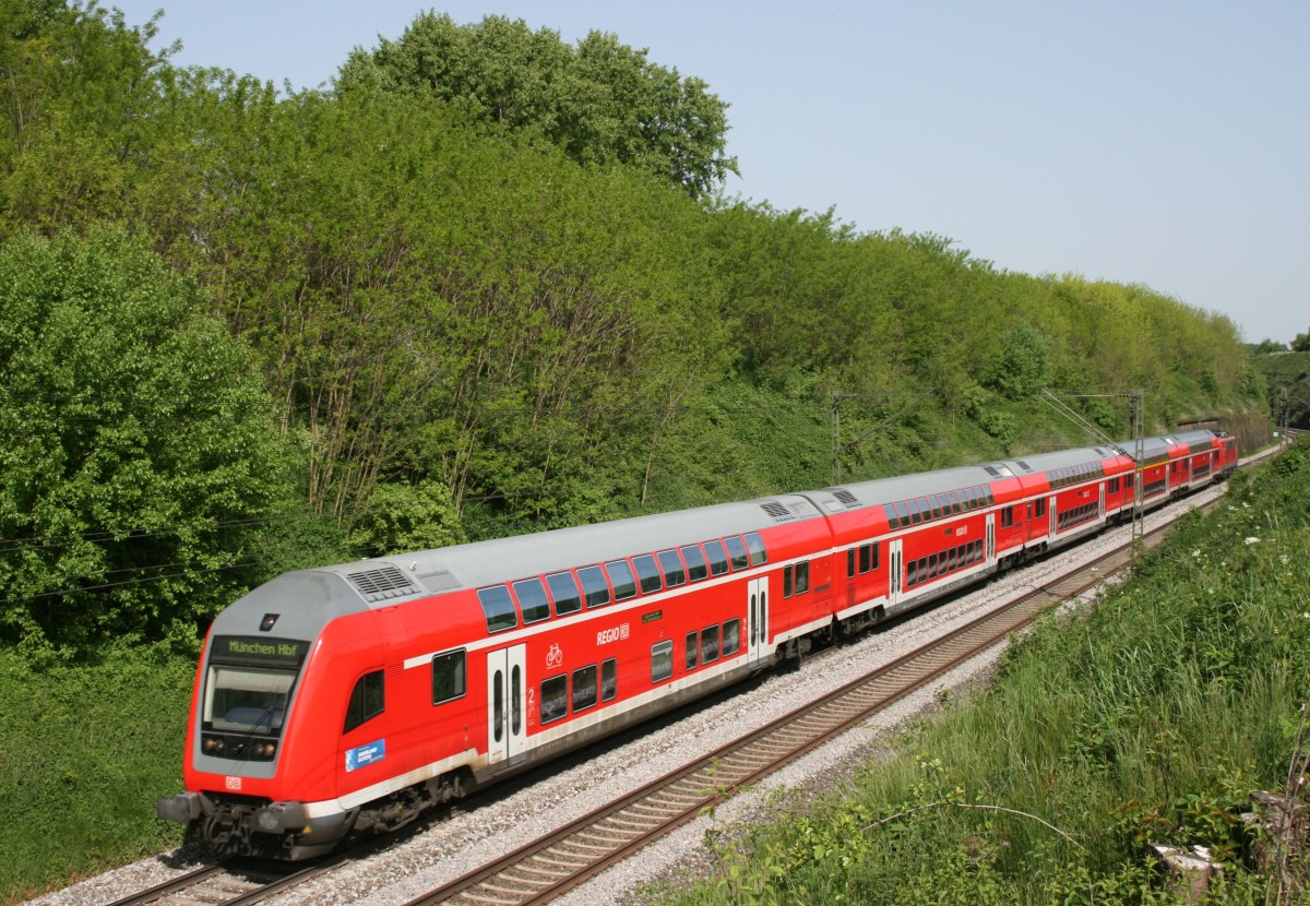 Steuerwagen voraus (geschoben von einer 120.2er) fährt der RE 9 - Rhein-Sieg-Express (Siegen – Köln - Aachen) durch Siegen-Eiserfeld in Richtung Köln, hier überquert er gerade die Sieg. Im Hintergrund die 105 m hohe Siegtalbrücke der A45 (Sauerlandlinie).