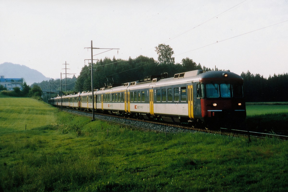 SBB: S-Bahn mit RABDe 12/12 (11101-11118, 1965/67) in Dreifachtraktion an einem frühen Morgen des Sommers 2004 bei Hinwil.