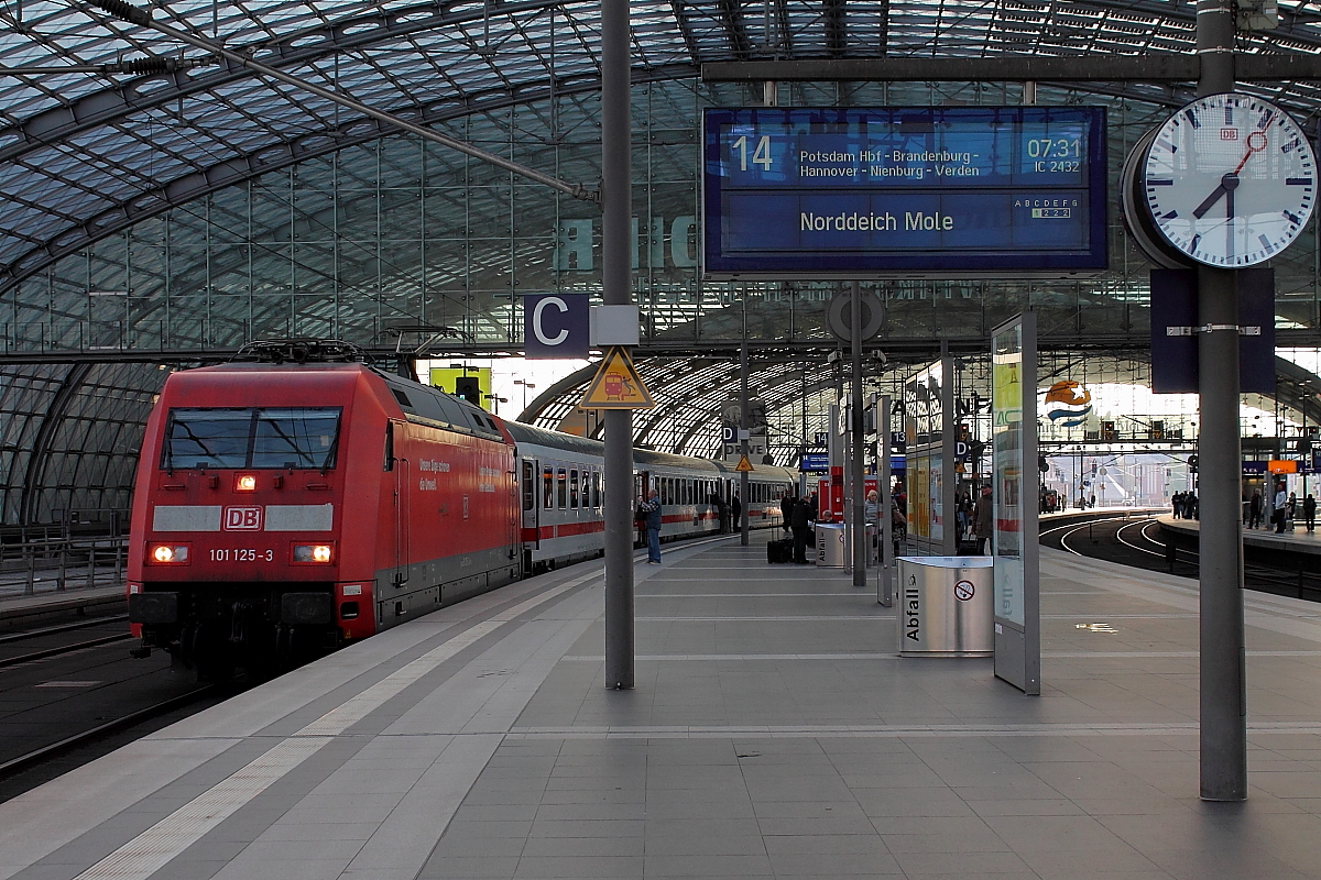 Stimmung am frühen Morgen des 01.05.2015 in Berlin Hauptbahnhof. Aus Cottbus ist gerade die 101 125-3 mit dem IC 2432 eingetroffen und alles andere ist ersichtlich.