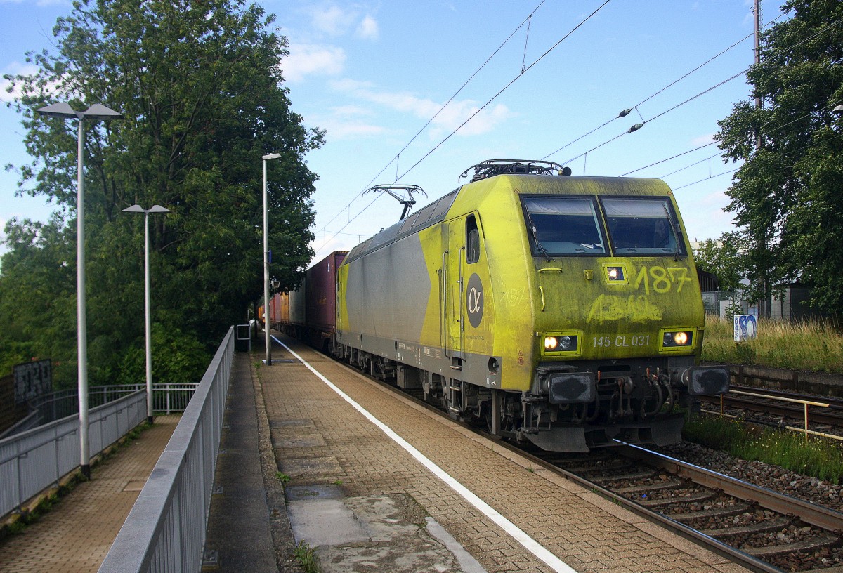 145 CL-031 von Alpha Trains kommt als Umleiter mit einem langen Containerzug aus Milano(I) nach Zeebrugge-Ramskapelle(B) und kommt durch Kohlscheid aus Richtung Herzogenrath und fährt die Kohlscheider-Rampe hoch nach Aachen-West.