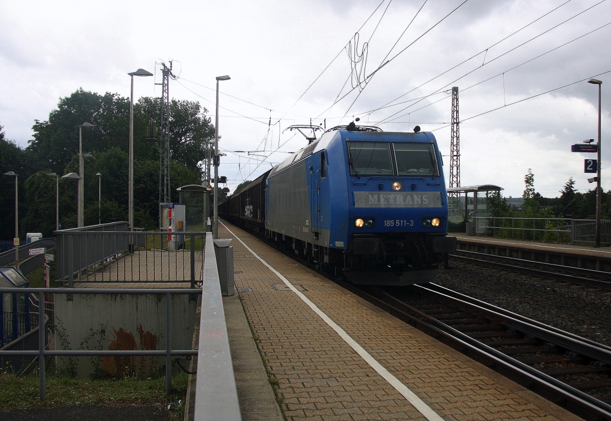 185 511-3 von Railtraxx kommt als Umleiter aus Richtung Aachen-West mit einem langen Coilzug aus Antwerpen-Waaslandhaven(B) nach Linz-Voestalpine(A) und fährt durch Kohlscheid und fährt in Richtung Herzogenrath,Neuss.
