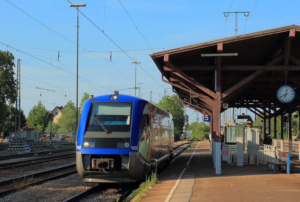 Am 05.08.2015 verlässt der aus Freiburg kommende X 73902 der SNCF den Bahnhof Neuenburg in Richtung Mulhouse