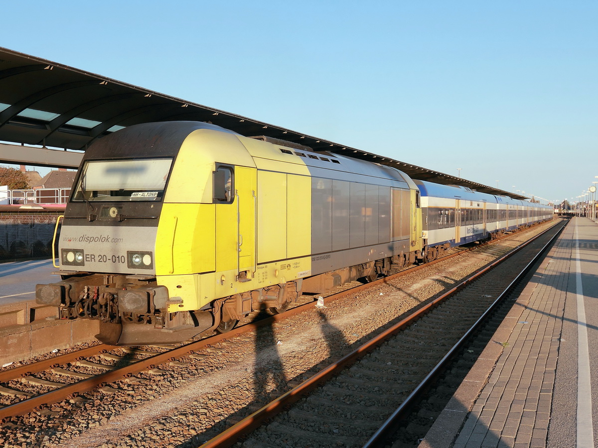 Ausfahrt NOB81733 nach Hamburg-Altona mit Schublok ER 20-010 (NVR Nummer 9280 1223 010-0-D-Dispo) am 13. August 2015 aus den Bahnhof Westerland(Sylt).