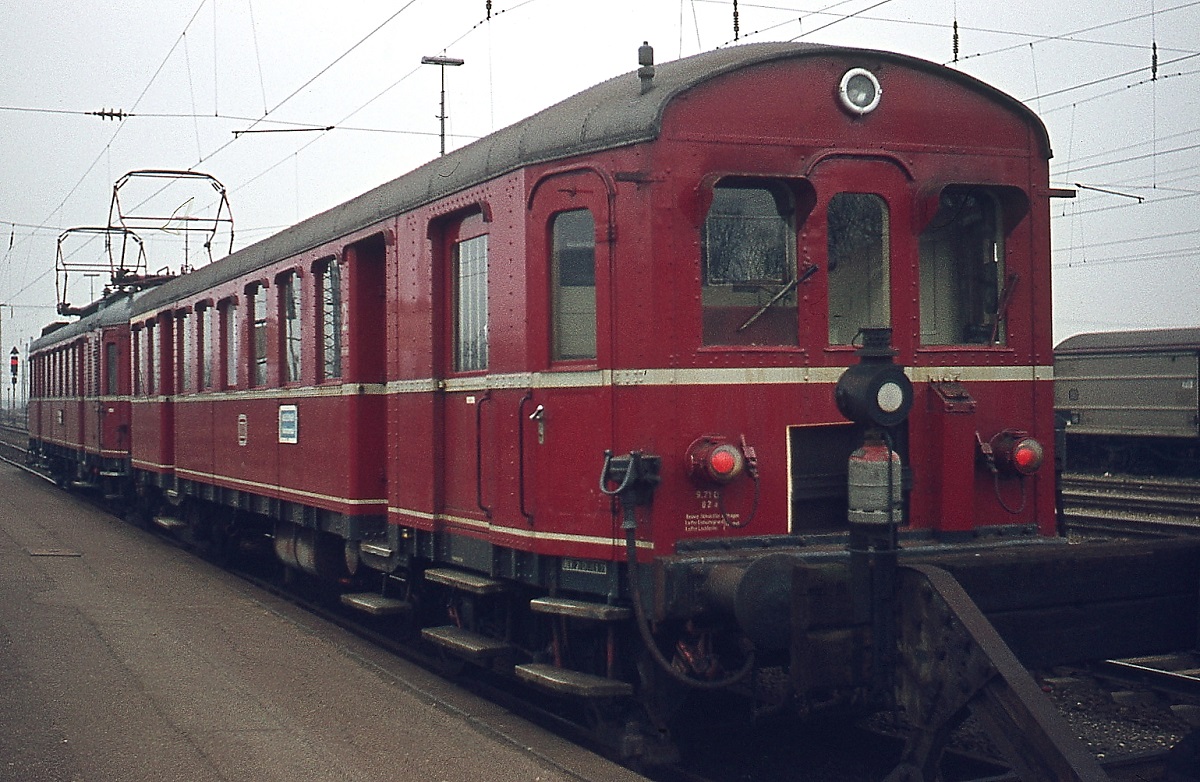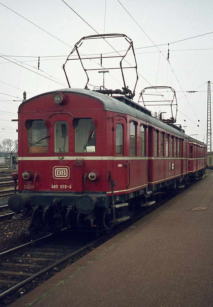 Zu den letzten Einsatzstrecken der zwischen 1927 und 1932 gebauten ET 85 gehörte die kurze Stichstrecke von Müllheim/Baden nach Neuenburg. Anfang Januar 1975 wartet 485 019-4 auf Gleis 5 im Bahnhof Müllheim/Baden auf Fahrgäste nach Neuenburg. Heute fahren die X 73900 der SNCF nach Mulhouse von diesem Gleis ab.