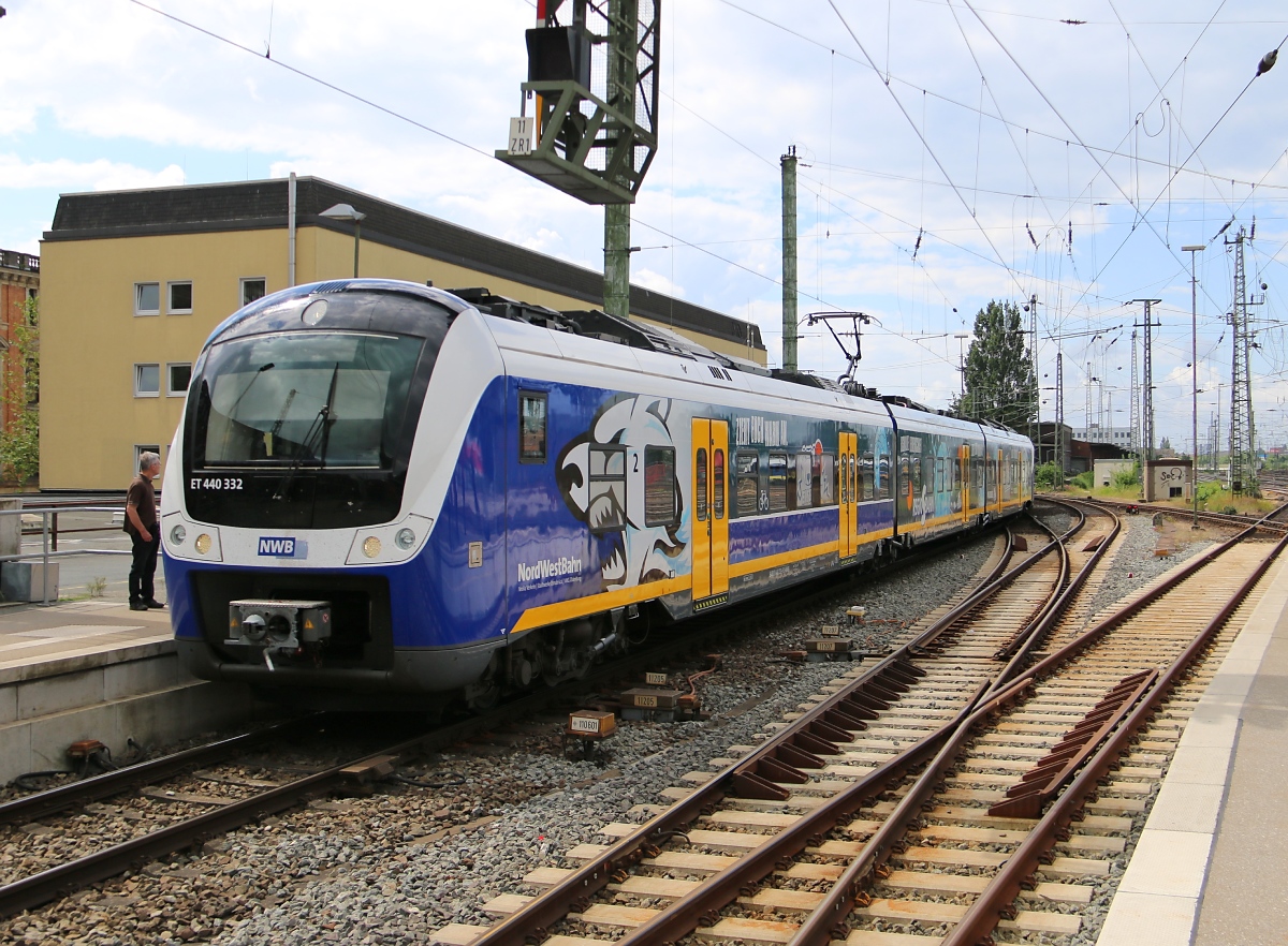 ET 440 332 der NWB als Werbeträger für die Eisbären Bremerhaven bei der Einfahrt nach Bremen Hauptbahnhof. Aufgenommen am 14.06.2014.