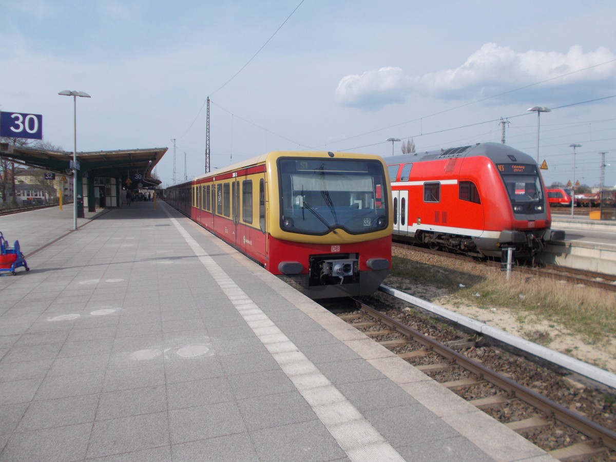 Täglicher Ablauf in Oranienburg:RE hält,S-Bahn wartet auf Anschluß.Aufgenommen am 11.April 2015.