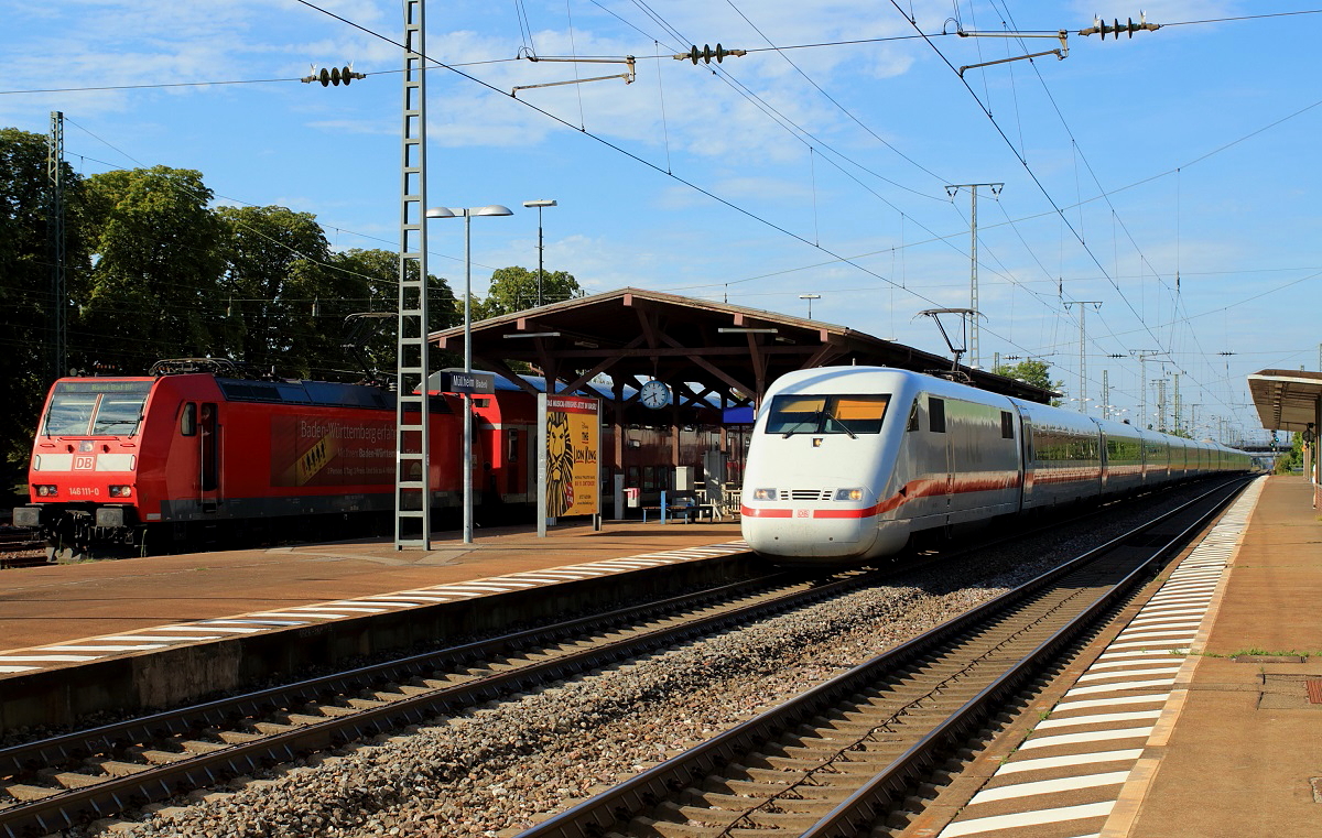 Wegen der Überholung durch einen verspäteten ICE mußte die 146 111-0 mit ihrem RE nach Basel Badischer Bahnhof am 07.08.2015 im Bahnhof Müllheim/Baden auf das Neuenburger Gleis ausweichen