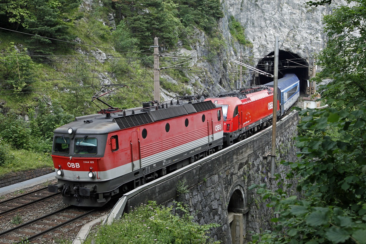 1144 125 + 1216 226 (kalt) verlassen mit Railjet 75 (Prag - Graz) am 3.08.2015 den Weinzettelwandtunnel der Semmeringbahn.