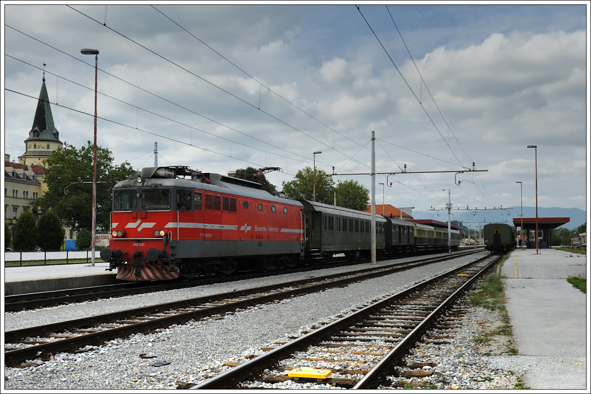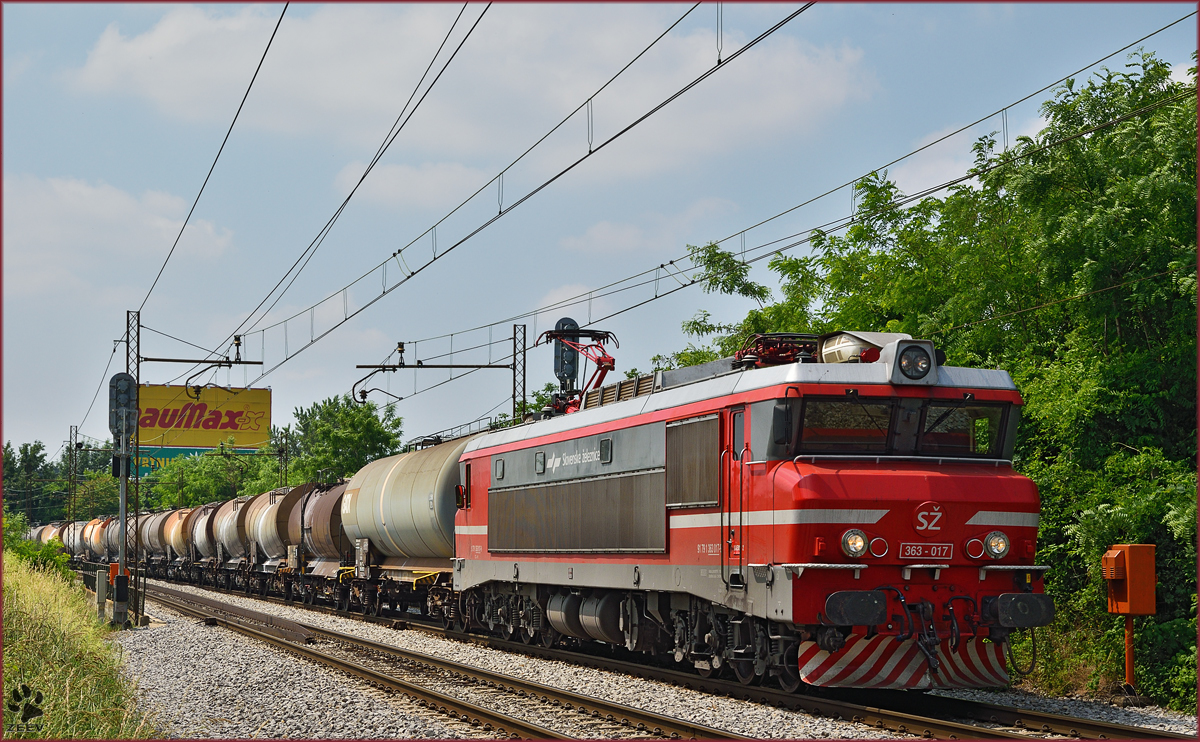 06-018 mit ihrem UEx 13420 von Celje nach Imeno am 1.8.2015 bei der Ausfahrt aus Šmarje pri Jelšah.