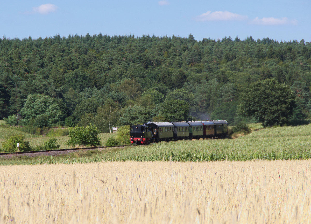 Am Rande des Hochwaldes (auch Schwarzwälder Hochwald genannt) liegt die Gemeinde Losheim am See. Bei Dampflokfreunden ist die Strecke Merzig Ost - Losheim - Dellborner Mühle bestens bekannt. Hier rollt der Sonderzug mit den Henschel Loks 26 + 34 im Sandwich die sanften Hügel in Richtung Merzig hinunter. Bahnstrecke 9321 Merzig - Büschfeld bei Bachem am 01.08.2015
